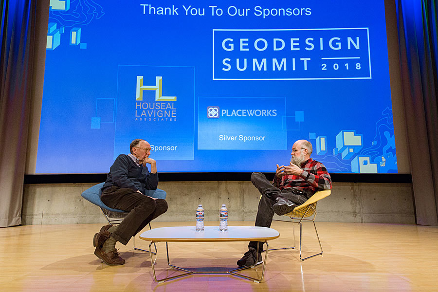 Esri president Jack Dangermond (left) chats with Morehouse about community engagement and urban planning during the 2018 Geodesign Summit.